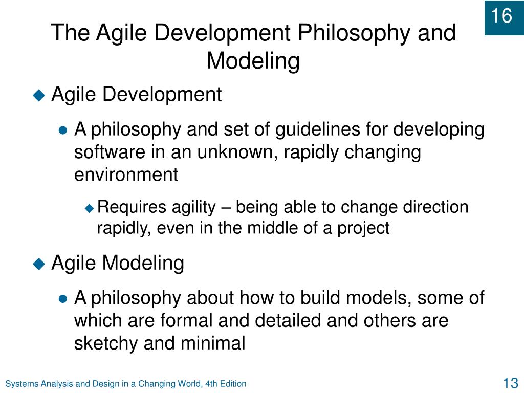 The Agile Development Philosophy and Modeling • Agile Development • A philosophy and set of guidelines for developing software in an unknown, rapidly changing environment • Requires agility – being able to change direction rapidly, even in the middle of a project • Agile Modeling • A philosophy about how to build models, some of which are formal and detailed and others are sketchy and minimal Systems Analysis and Design in a Changing World, 4th Edition