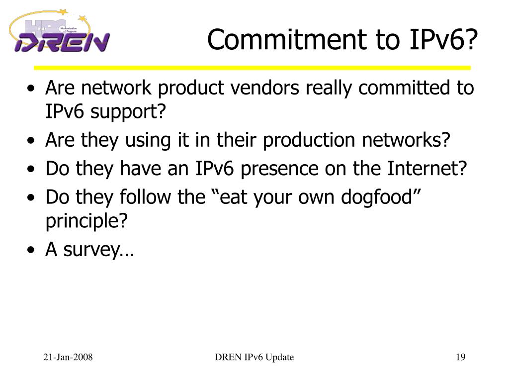 Commitment to IPv6? • Are network product vendors really committed to IPv6 support? • Are they using it in their production networks? • Do they have an IPv6 presence on the Internet? • Do they follow the “eat your own dogfood” principle? • A survey… DREN IPv6 Update