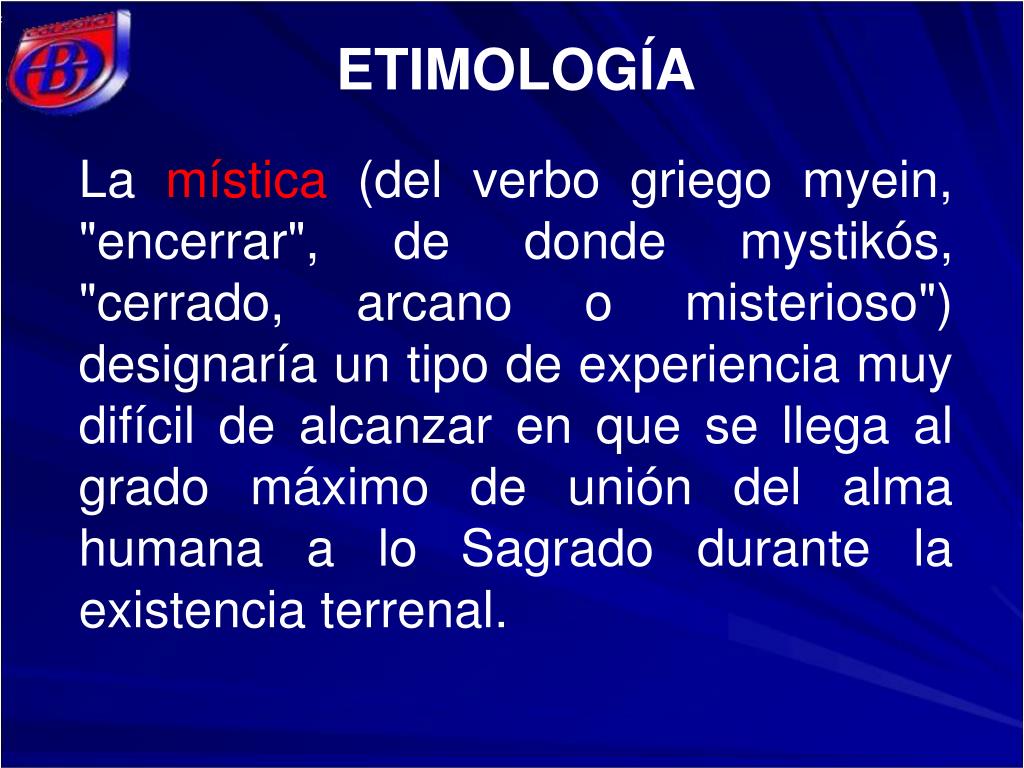 ETIMOLOGÍA La mística (del verbo griego myein, "encerrar", de donde mystikós, "cerrado, arcano o misterioso") designaría un tipo de experiencia muy difícil de alcanzar en que se llega al grado máximo de unión del alma humana a lo Sagrado durante la existencia terrenal.