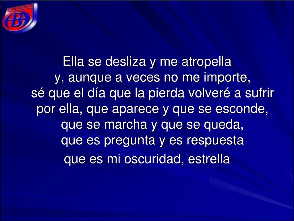 Ella se desliza y me atropellay, aunque a veces no me importe,sé que el día que la pierda volveré a sufrirpor ella, que aparece y que se esconde,que se marcha y que se queda,que es pregunta y es respuesta que es mi oscuridad, estrella