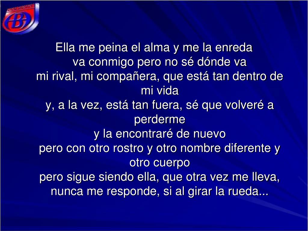Ella me peina el alma y me la enredava conmigo pero no sé dónde vami rival, mi compañera, que está tan dentro de mi viday, a la vez, está tan fuera, sé que volveré a perdermey la encontraré de nuevopero con otro rostro y otro nombre diferente y otro cuerpopero sigue siendo ella, que otra vez me lleva,nunca me responde, si al girar la rueda...