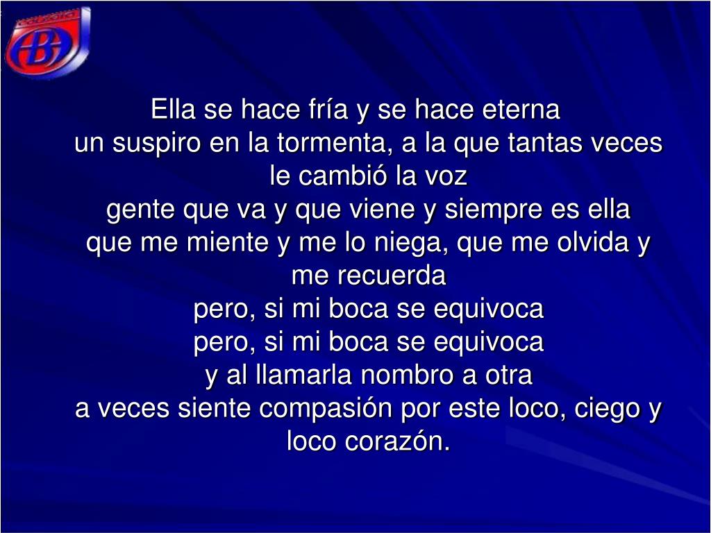 Ella se hace fría y se hace eternaun suspiro en la tormenta, a la que tantas veces le cambió la vozgente que va y que viene y siempre es ellaque me miente y me lo niega, que me olvida y me recuerdapero, si mi boca se equivocapero, si mi boca se equivocay al llamarla nombro a otraa veces siente compasión por este loco, ciego y loco corazón.