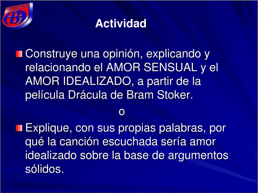 Actividad • Construye una opinión, explicando y relacionando el AMOR SENSUAL y el AMOR IDEALIZADO, a partir de la película Drácula de BramStoker. o • Explique, con sus propias palabras, por qué la canción escuchada sería amor idealizado sobre la base de argumentos sólidos.
