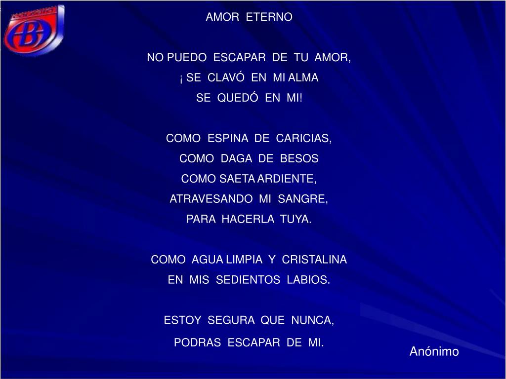 AMOR ETERNO NO PUEDO ESCAPAR DE TU AMOR, ¡ SE CLAVÓ EN MI ALMA SE QUEDÓ EN MI! COMO ESPINA DE CARICIAS, COMO DAGA DE BESOS COMO SAETA ARDIENTE, ATRAVESANDO MI SANGRE, PARA HACERLA TUYA. COMO AGUA LIMPIA Y CRISTALINA EN MIS SEDIENTOS LABIOS. ESTOY SEGURA QUE NUNCA, PODRAS ESCAPAR DE MI. Anónimo