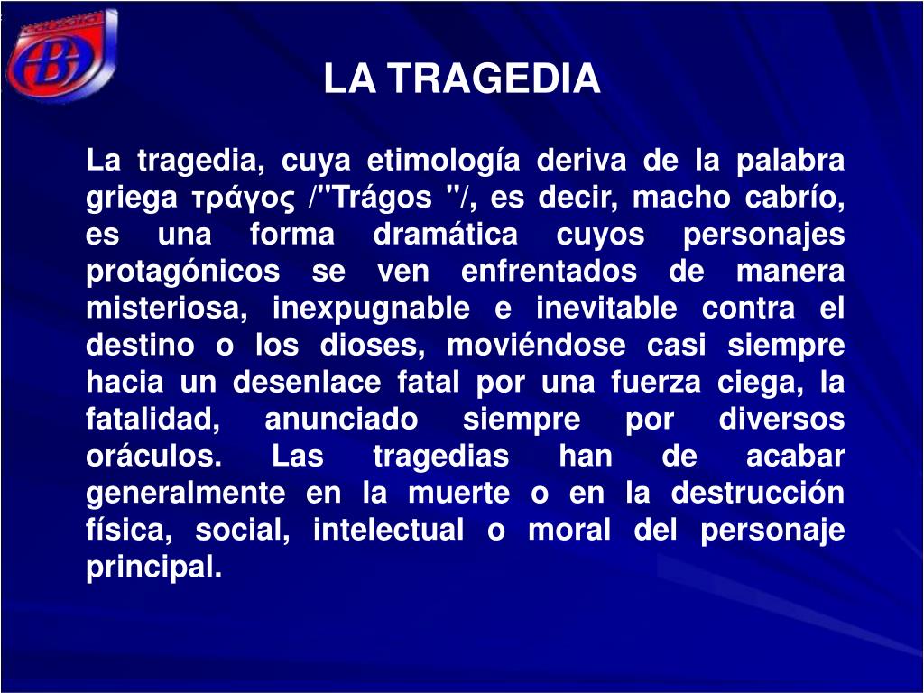 LA TRAGEDIA La tragedia, cuya etimología deriva de la palabra griega τράγος /"Trágos "/, es decir, macho cabrío, es una forma dramática cuyos personajes protagónicos se ven enfrentados de manera misteriosa, inexpugnable e inevitable contra el destino o los dioses, moviéndose casi siempre hacia un desenlace fatal por una fuerza ciega, la fatalidad, anunciado siempre por diversos oráculos. Las tragedias han de acabar generalmente en la muerte o en la destrucción física, social, intelectual o moral del personaje principal.