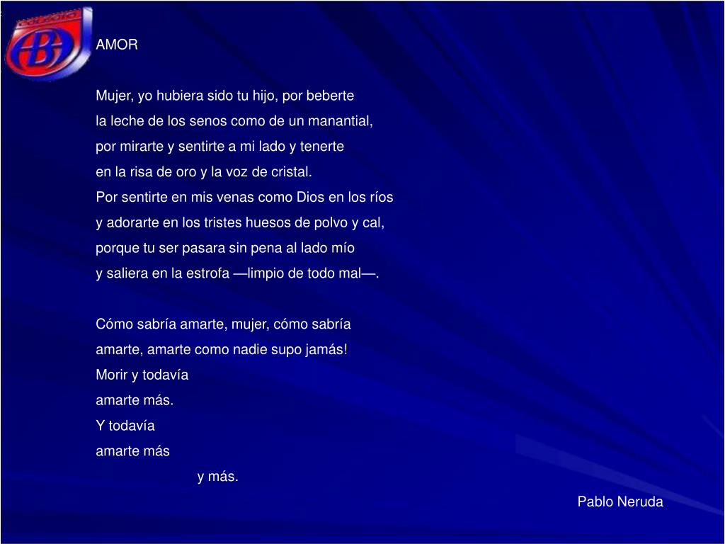 AMOR Mujer, yo hubiera sido tu hijo, por beberte la leche de los senos como de un manantial, por mirarte y sentirte a mi lado y tenerte en la risa de oro y la voz de cristal. Por sentirte en mis venas como Dios en los ríos y adorarte en los tristes huesos de polvo y cal, porque tu ser pasara sin pena al lado mío y saliera en la estrofa —limpio de todo mal—. Cómo sabría amarte, mujer, cómo sabría amarte, amarte como nadie supo jamás! Morir y todavía amarte más. Y todavía amarte más y más. Pablo Neruda