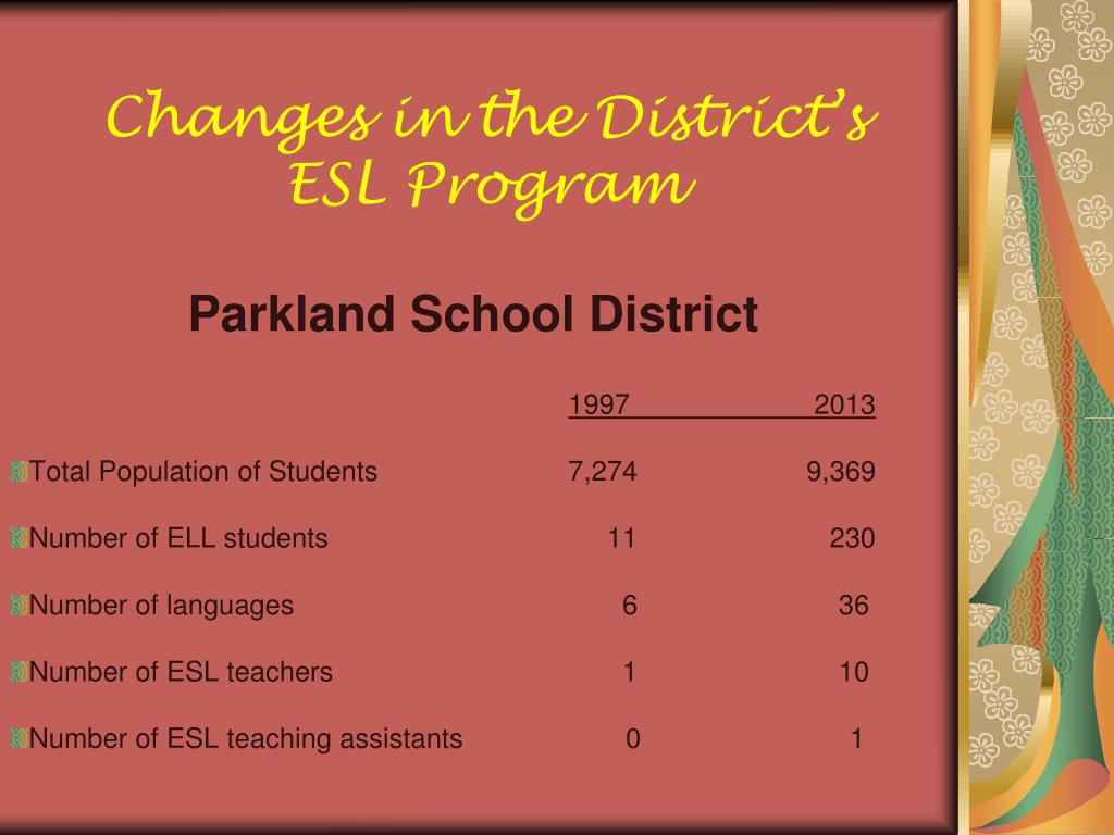 Changes in the District’sESL Program Parkland School District 1997 2013 • Total Population of Students 7,274 9,369 • Number of ELL students 11 230 • Number of languages 6 36 • Number of ESL teachers 1 10 • Number of ESL teaching assistants 0 1