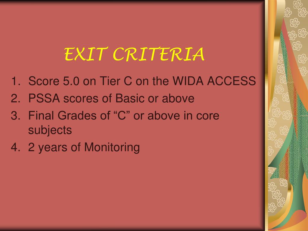 EXIT CRITERIA • Score 5.0 on Tier C on the WIDA ACCESS • PSSA scores of Basic or above • Final Grades of “C” or above in core subjects • 2 years of Monitoring