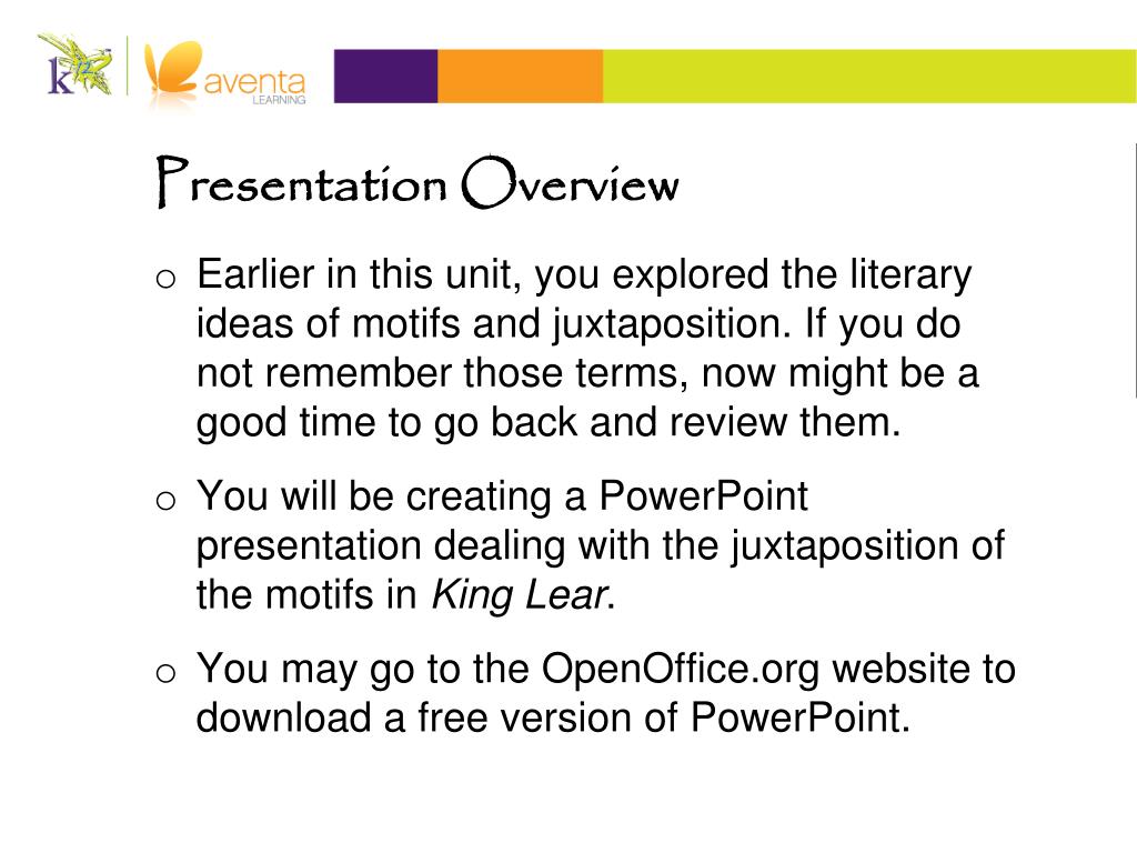 Presentation Overview • Earlier in this unit, you explored the literary ideas of motifs and juxtaposition. If you do not remember those terms, now might be a good time to go back and review them. • You will be creating a PowerPoint presentation dealing with the juxtaposition of the motifs in King Lear. • You may go to the OpenOffice.org website to download a free version of PowerPoint.