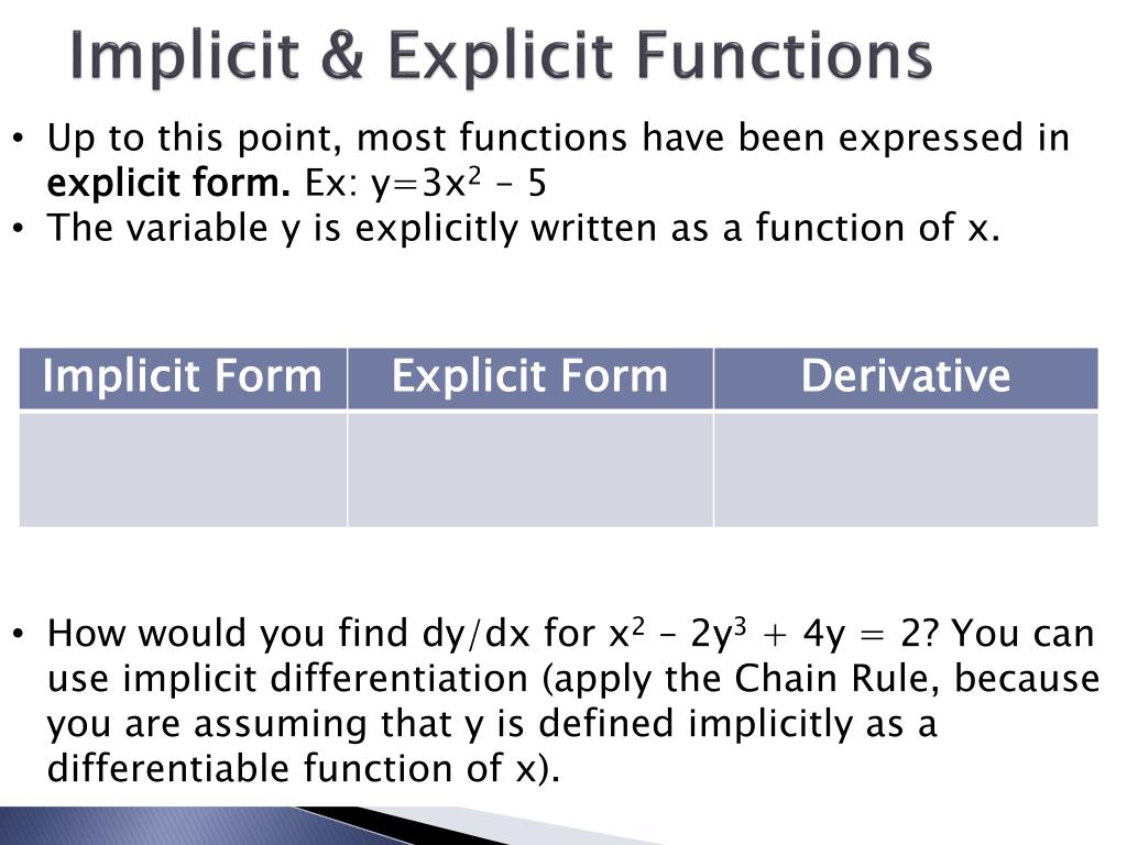 Implicit & Explicit Functions • Up to this point, most functions have been expressed in explicit form. Ex: y=3x2– 5 • The variable y is explicitly written as a function of x. • How would you find dy/dx for x2 – 2y3 + 4y = 2? You can use implicit differentiation (apply the Chain Rule, because you are assuming that y is defined implicitly as a differentiable function of x).