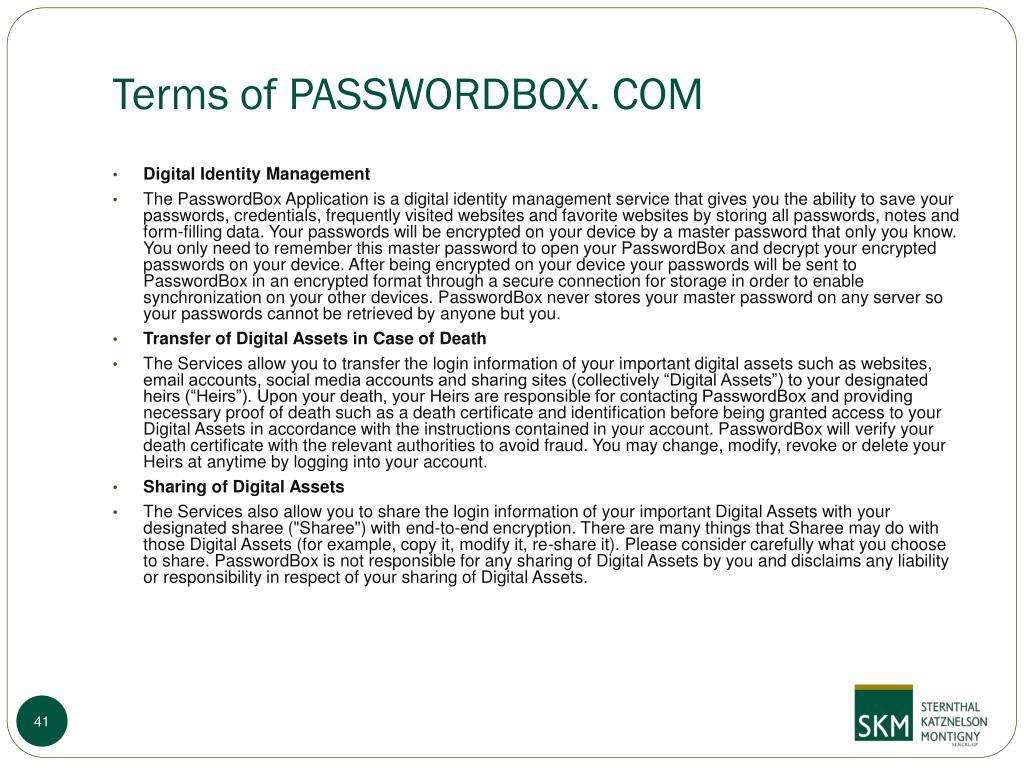 Terms of PASSWORDBOX. COM • Digital Identity Management • The PasswordBox Application is a digital identity management service that gives you the ability to save your passwords, credentials, frequently visited websites and favorite websites by storing all passwords, notes and form-filling data. Your passwords will be encrypted on your device by a master password that only you know. You only need to remember this master password to open your PasswordBox and decrypt your encrypted passwords on your device. After being encrypted on your device your passwords will be sent to PasswordBox in an encrypted format through a secure connection for storage in order to enable synchronization on your other devices. PasswordBox never stores your master password on any server so your passwords cannot be retrieved by anyone but you. • Transfer of Digital Assets in Case of Death • The Services allow you to transfer the login information of your important digital assets such as websites, email accounts, social media accounts and sharing sites (collectively “Digital Assets”) to your designated heirs (“Heirs”). Upon your death, your Heirs are responsible for contacting PasswordBox and providing necessary proof of death such as a death certificate and identification before being granted access to your Digital Assets in accordance with the instructions contained in your account. PasswordBox will verify your death certificate with the relevant authorities to avoid fraud. You may change, modify, revoke or delete your Heirs at anytime by logging into your account. • Sharing of Digital Assets • The Services also allow you to share the login information of your important Digital Assets with your designated sharee ("Sharee") with end-to-end encryption. There are many things that Sharee may do with those Digital Assets (for example, copy it, modify it, re-share it). Please consider carefully what you choose to share. PasswordBox is not responsible for any sharing of Digital Assets by you and disclaims any liability or responsibility in respect of your sharing of Digital Assets.