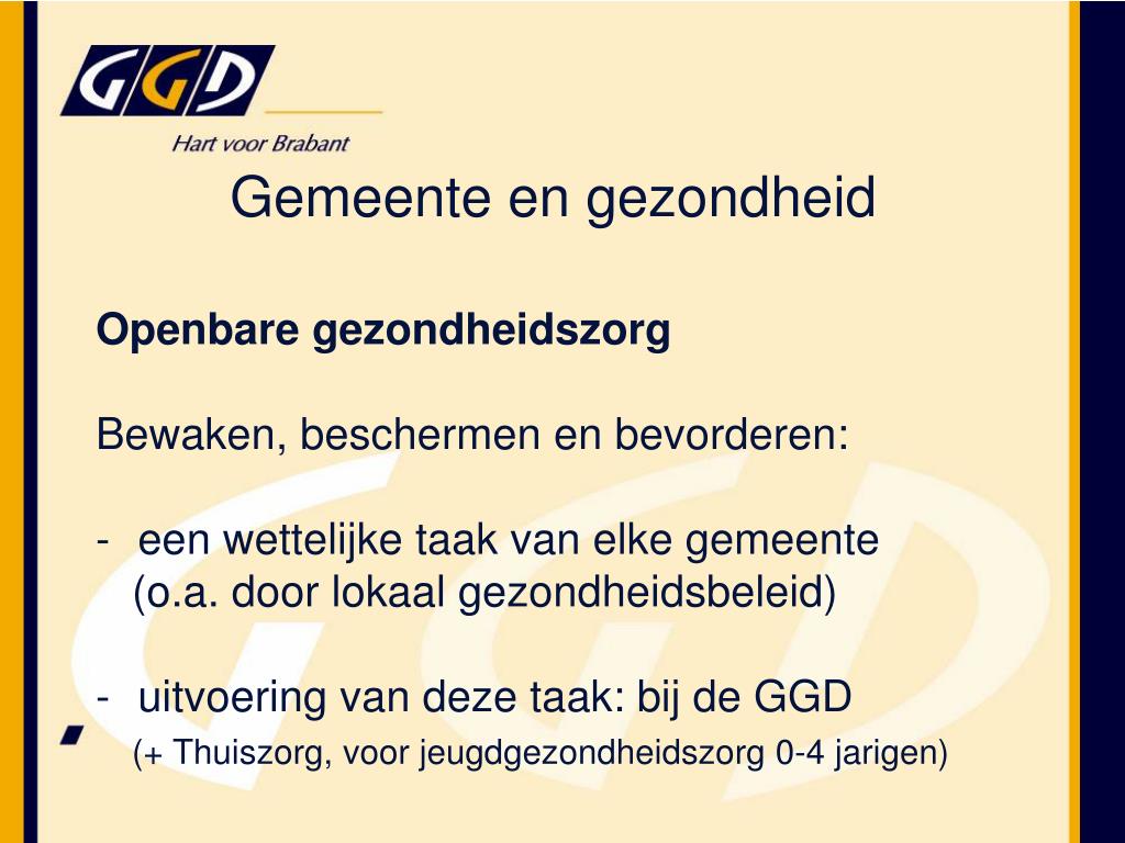 Openbare gezondheidszorg Bewaken, beschermen en bevorderen: een wettelijke taak van elke gemeente (o.a. door lokaal gezondheidsbeleid) uitvoering van deze taak: bij de GGD (+ Thuiszorg, voor jeugdgezondheidszorg 0-4 jarigen) Gemeente en gezondheid