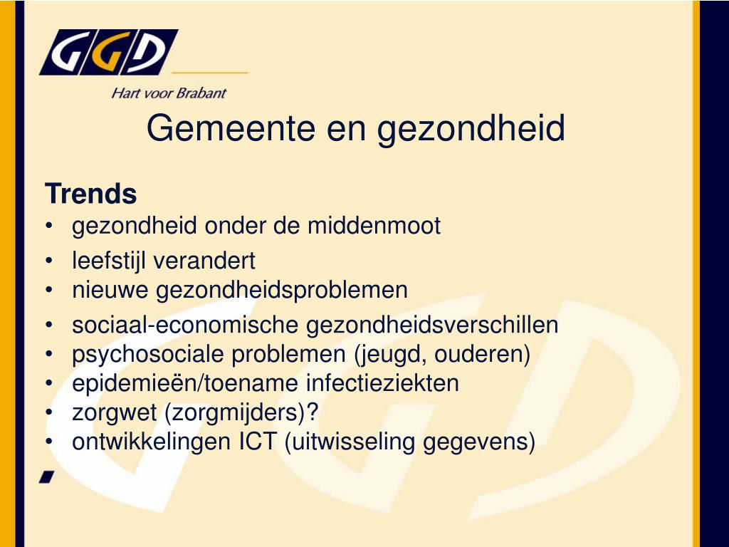 Trends gezondheid onder de middenmoot leefstijl verandert nieuwe gezondheidsproblemen sociaal-economische gezondheidsverschillen psychosociale problemen (jeugd, ouderen) epidemieën/toename infectieziekten zorgwet (zorgmijders)? ontwikkelingen ICT (uitwisseling gegevens) Gemeente en gezondheid