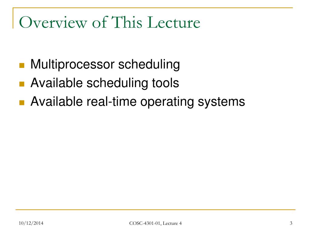 Overview of This Lecture • Multiprocessor scheduling • Available scheduling tools • Available real-time operating systems COSC-4301-01, Lecture 4