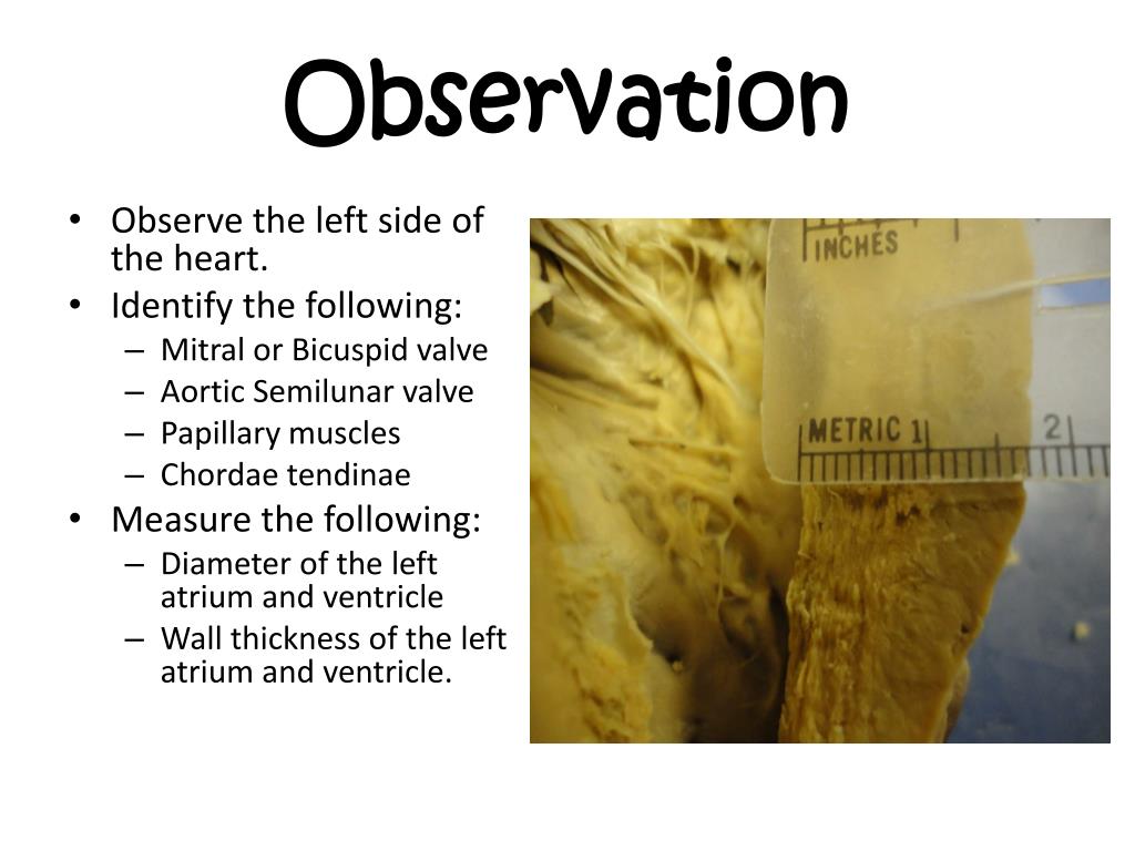 Observation • Observe the left side of the heart. • Identify the following: • Mitral or Bicuspid valve • Aortic Semilunar valve • Papillary muscles • Chordaetendinae • Measure the following: • Diameter of the left atrium and ventricle • Wall thickness of the left atrium and ventricle.