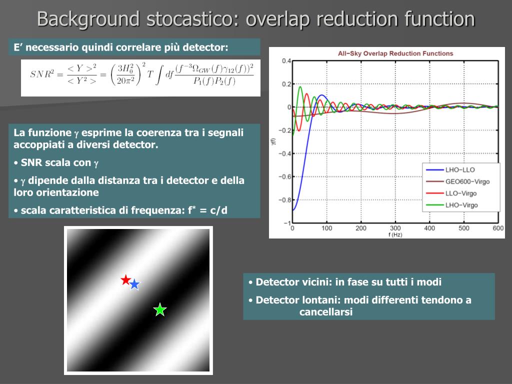 Background stocastico: overlap reduction function E’ necessario quindi correlare più detector: • La funzione esprime la coerenza tra i segnali accoppiati a diversi detector. • SNR scala con • dipende dalla distanza tra i detector e della loro orientazione • scala caratteristica di frequenza: f* = c/d • Detector vicini: in fase su tutti i modi • Detector lontani: modi differenti tendono a cancellarsi