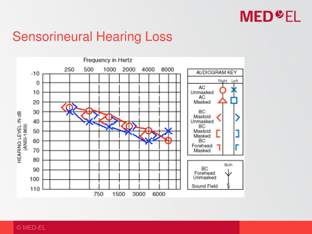 Types of Hearing Loss • Normal Hearing • Conductive Hearing Loss • Problem in the outer or middle ear • Sensorineural Hearing Loss • Problem in the inner ear • Mixed Hearing Loss • Problem both in the outer/middle AND inner ear