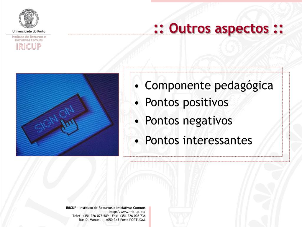 :: Outros aspectos :: • Componente pedagógica • Pontos positivos • Pontos negativos • Pontos interessantes IRICUP - Instituto de Recursos e Iniciativas Comuns http://www.iric.up.pt/ Telef: +351 226 073 589 - Fax: +351 226 098 736 Rua D. Manuel II, 4050-345 Porto PORTUGAL