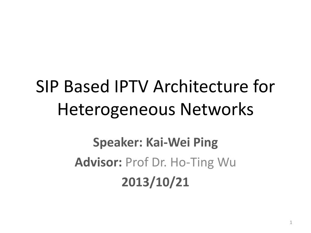 SIP Based IPTV Architecture for Heterogeneous Networks Speaker: Kai-Wei Ping Advisor: Prof Dr. Ho-Ting Wu 2013/10/21