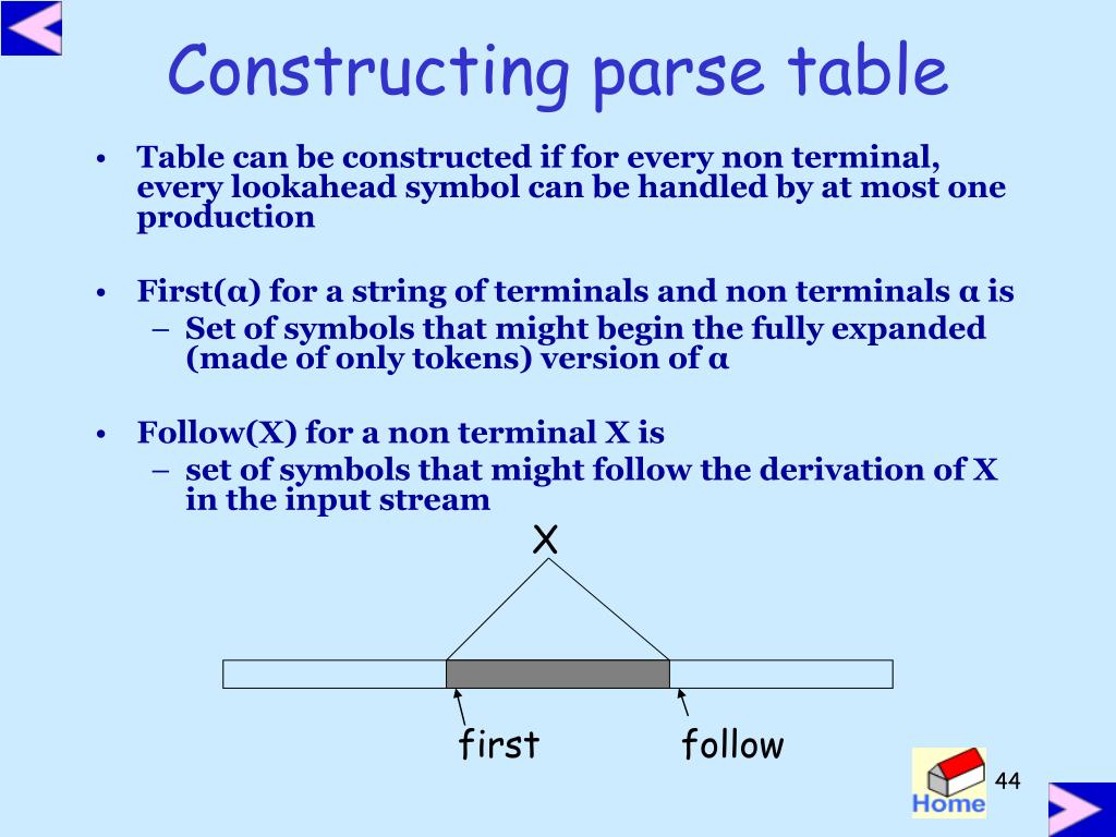 X first follow Constructing parse table • Table can be constructed if for every non terminal, every lookahead symbol can be handled by at most one production • First(α) for a string of terminals and non terminals α is • Set of symbols that might begin the fully expanded (made of only tokens) version of α • Follow(X) for a non terminal X is • set of symbols that might follow the derivation of X in the input stream