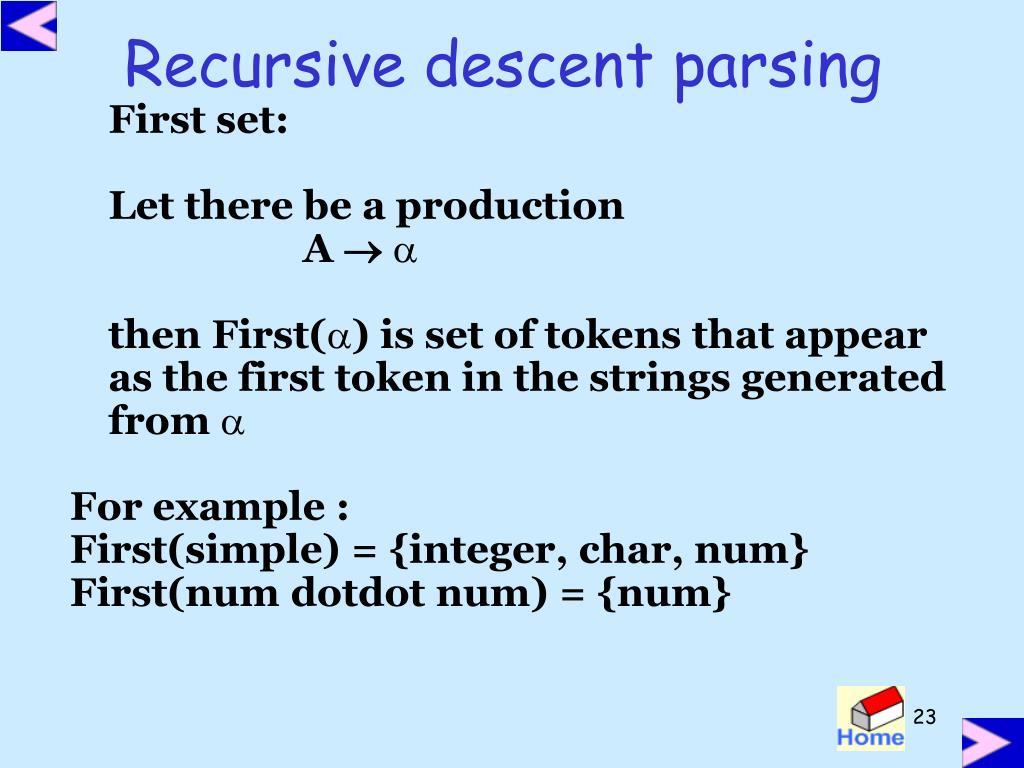 Recursive descent parsing First set: Let there be a production A then First() is set of tokens that appear as the first token in the strings generated from For example : First(simple) = {integer, char, num} First(num dotdot num) = {num}