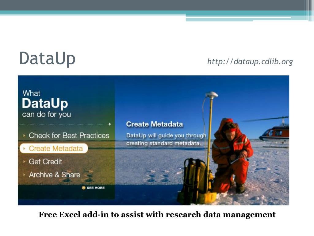 DataUphttp://dataup.cdlib.org Free Excel add-in to assist with research data management