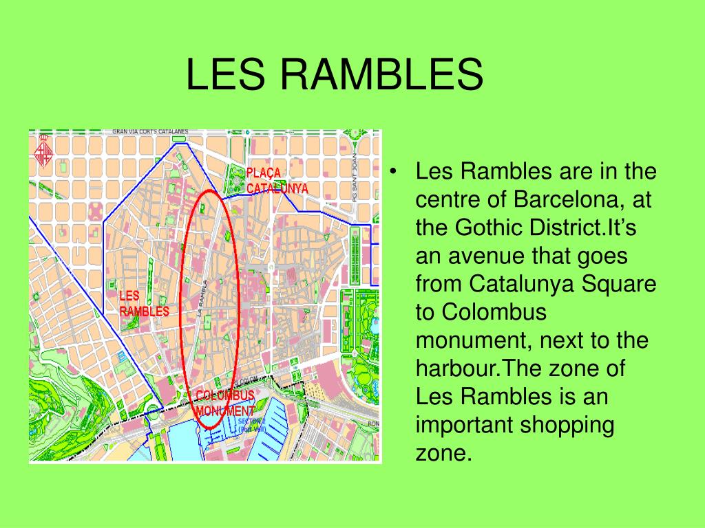 LES RAMBLES • Les Rambles are in the centre of Barcelona, at the Gothic District.It’s an avenue that goes from Catalunya Square to Colombus monument, next to the harbour.The zone of Les Rambles is an important shopping zone.