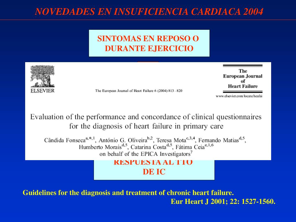 NOVEDADES EN INSUFICIENCIA CARDIACA 2004 SINTOMAS EN REPOSO O DURANTE EJERCICIO EVIDENCIA DE DISFUNCION CARDIACA EN REPOSO RESPUESTA AL TTO DE IC Guidelines for the diagnosis and treatment of chronic heart failure. Eur Heart J 2001; 22: 1527-1560.