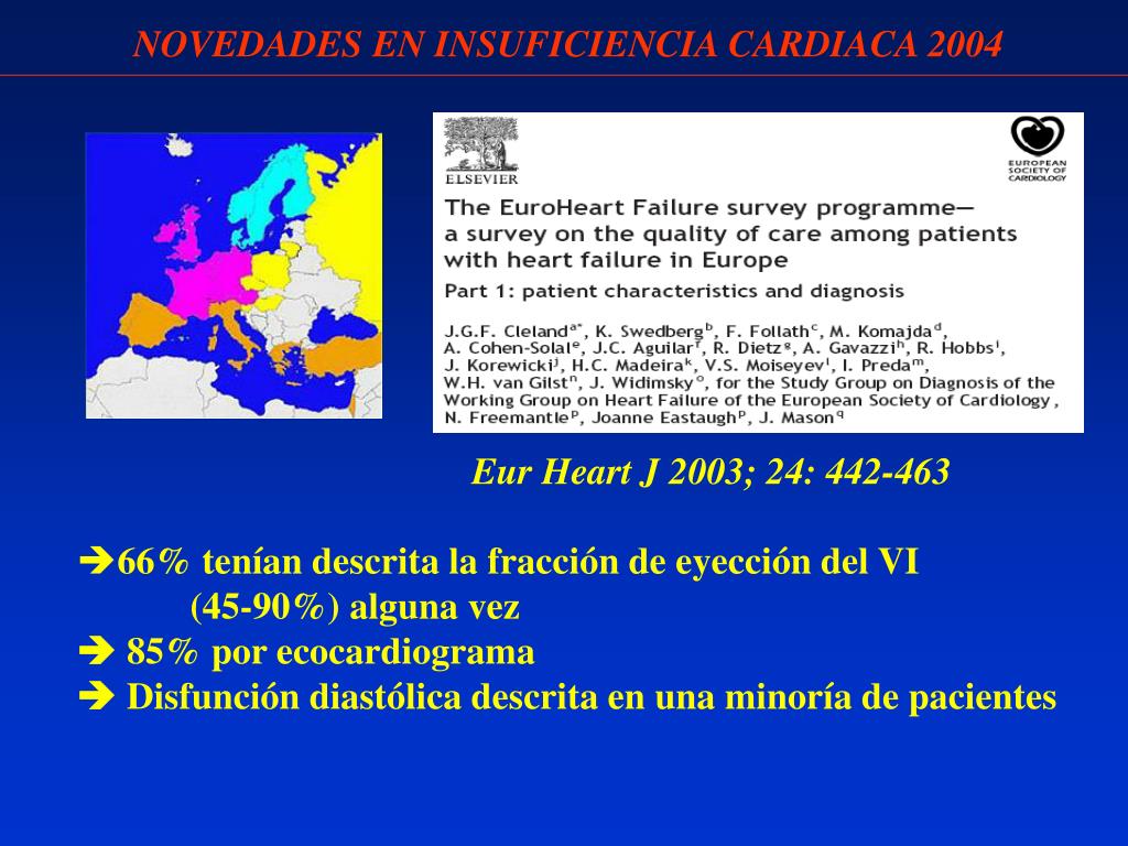 NOVEDADES EN INSUFICIENCIA CARDIACA 2004 Eur Heart J 2003; 24: 442-463 • 66% tenían descrita la fracción de eyección del VI (45-90%) alguna vez • 85% por ecocardiograma • Disfunción diastólica descrita en una minoría de pacientes