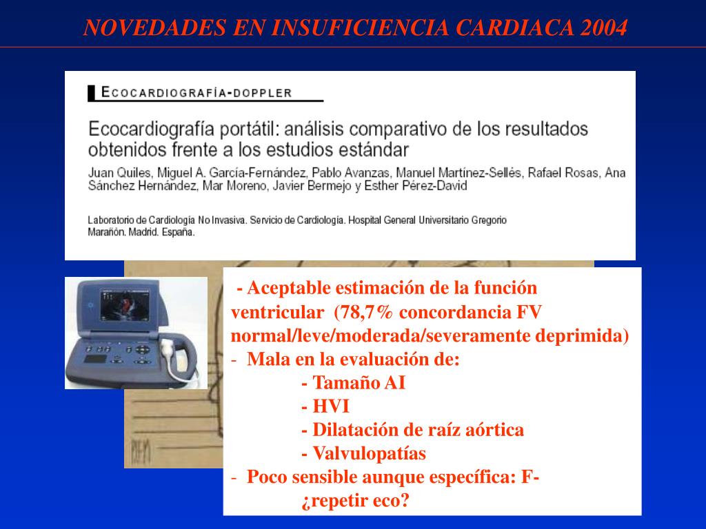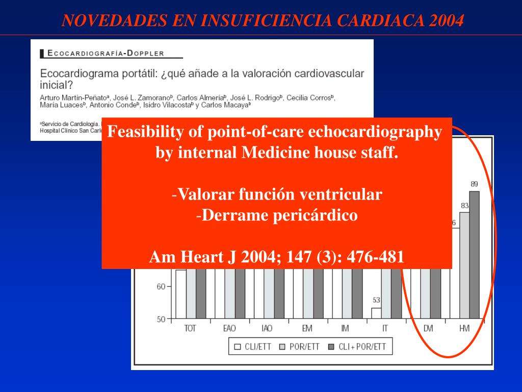 NOVEDADES EN INSUFICIENCIA CARDIACA 2004 • Feasibility of point-of-care echocardiography • by internal Medicine house staff. • Valorar función ventricular • Derrame pericárdico • Am Heart J 2004; 147 (3): 476-481