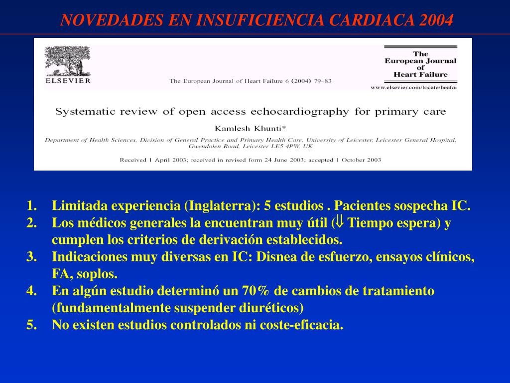 NOVEDADES EN INSUFICIENCIA CARDIACA 2004 • Limitada experiencia (Inglaterra): 5 estudios . Pacientes sospecha IC. • Los médicos generales la encuentran muy útil ( Tiempo espera) y cumplen los criterios de derivación establecidos. • Indicaciones muy diversas en IC: Disnea de esfuerzo, ensayos clínicos, FA, soplos. • En algún estudio determinó un 70% de cambios de tratamiento (fundamentalmente suspender diuréticos) • No existen estudios controlados ni coste-eficacia.