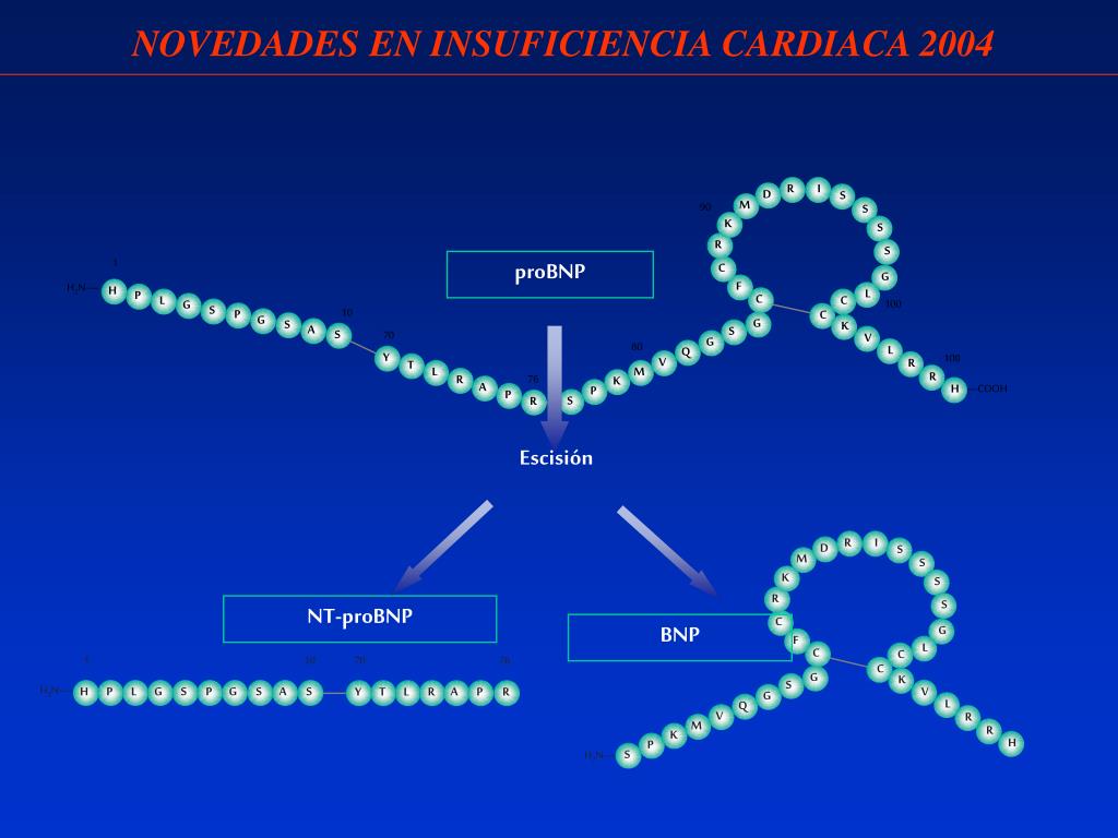 R I D S 90 M S K S R S 1 C G H2N— F H L P C 100 L C G 10 S P C G G S K A 70 S S V G 80 L Q 108 Y V R T L M 76 R R K —COOH A H P P S R 1 10 70 76 H H2N— P L G S P G S A S Y T L R A P R NOVEDADES EN INSUFICIENCIA CARDIACA 2004 proBNP Escisión R I D S M S K S R NT-proBNP S C BNP G F L C C C G K S V G L Q V R M R K H P H2N— S