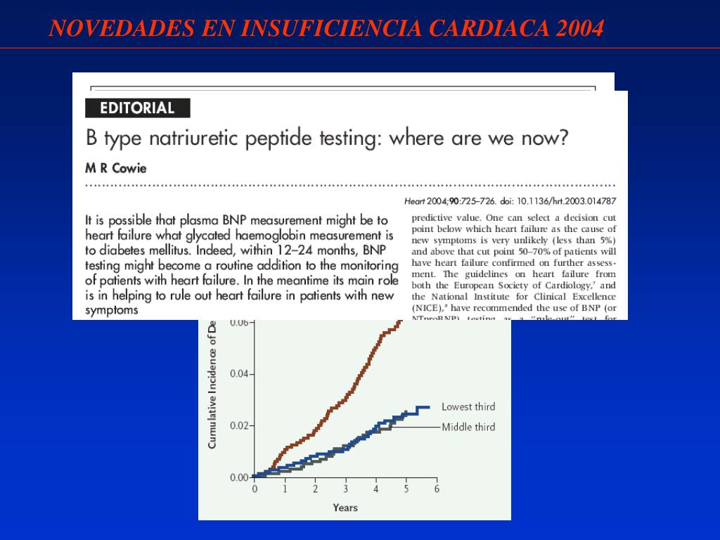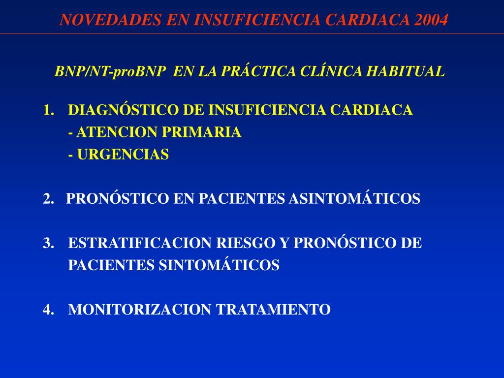NOVEDADES EN INSUFICIENCIA CARDIACA 2004 • BNP/NT-proBNP EN LA PRÁCTICA CLÍNICA HABITUAL • DIAGNÓSTICO DE INSUFICIENCIA CARDIACA • - ATENCION PRIMARIA • - URGENCIAS • 2. PRONÓSTICO EN PACIENTES ASINTOMÁTICOS • 3. ESTRATIFICACION RIESGO Y PRONÓSTICO DE PACIENTES SINTOMÁTICOS • 4. MONITORIZACION TRATAMIENTO