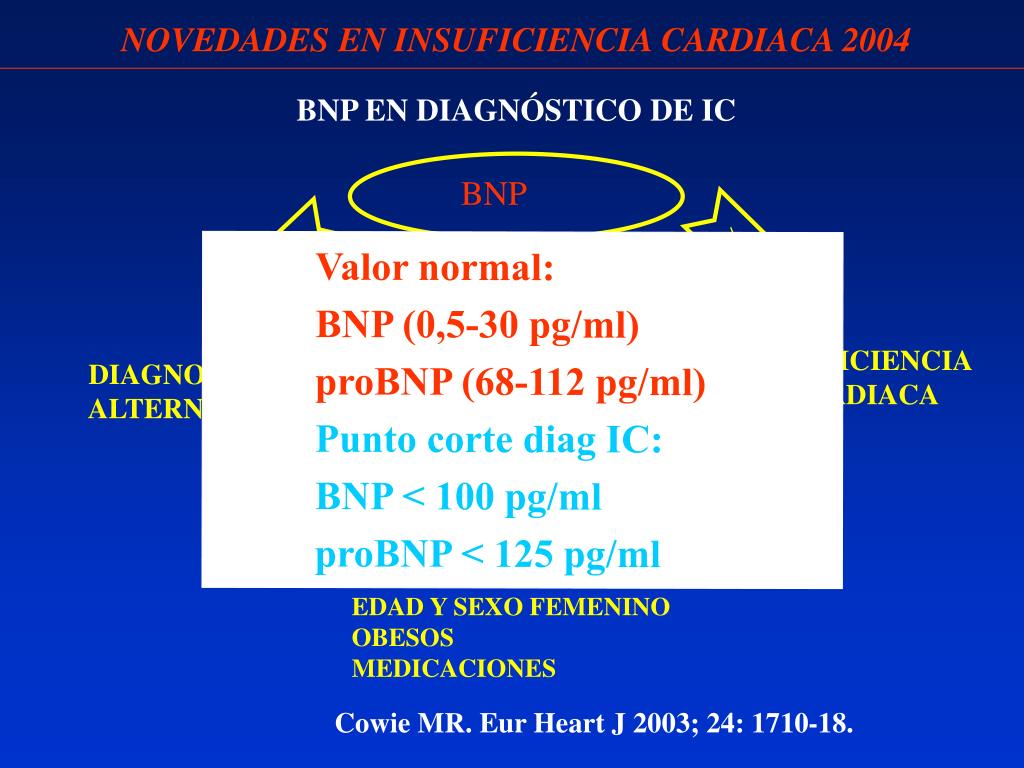 NOVEDADES EN INSUFICIENCIA CARDIACA 2004 BNP EN DIAGNÓSTICO DE IC 100-500 BNP >500 Valor normal: BNP (0,5-30 pg/ml) proBNP (68-112 pg/ml) Punto corte diag IC: BNP < 100 pg/ml proBNP < 125 pg/ml < 100 INSUFICIENCIA CARDIACA DIAGNOSTICO ALTERNATIVO INSUFICIENCIA RENAL INFARTO ENFS PULMONARES VD HIPERTROFIA VI FIBRILACION AURICULAR ENFERM. TIROIDEAS EDAD Y SEXO FEMENINO OBESOS MEDICACIONES Cowie MR. Eur Heart J 2003; 24: 1710-18.