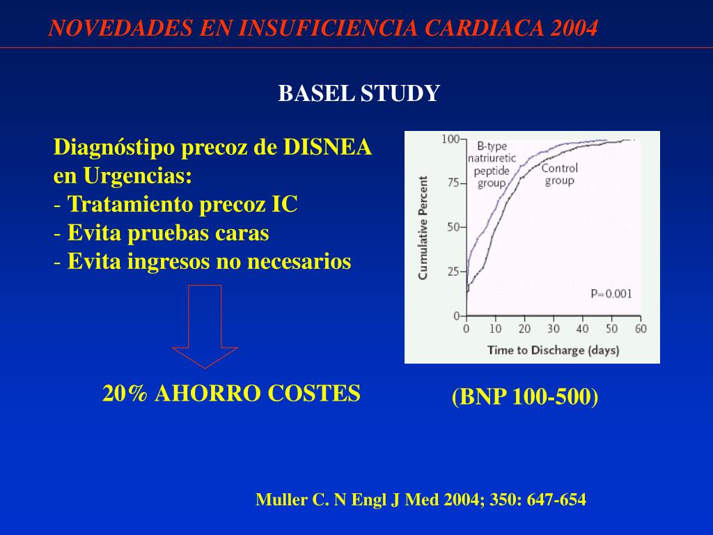 NOVEDADES EN INSUFICIENCIA CARDIACA 2004 BASEL STUDY • Diagnóstipo precoz de DISNEA • en Urgencias: • Tratamiento precoz IC • Evita pruebas caras • Evita ingresos no necesarios 20% AHORRO COSTES (BNP 100-500) Muller C. N Engl J Med 2004; 350: 647-654