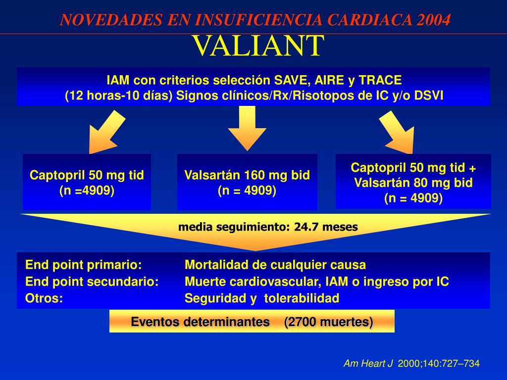 NOVEDADES EN INSUFICIENCIA CARDIACA 2004 VALIANT IAM con criterios selección SAVE, AIRE y TRACE (12 horas-10 días) Signos clínicos/Rx/Risotopos de IC y/o DSVI Captopril 50 mg tid (n =4909) Valsartán 160 mg bid (n = 4909) Captopril 50 mg tid + Valsartán 80 mg bid (n = 4909) media seguimiento: 24.7 meses End point primario: Mortalidad de cualquier causa End point secundario: Muerte cardiovascular, IAM o ingreso por IC Otros: Seguridad y tolerabilidad Eventos determinantes (2700 muertes) Am Heart J 2000;140:727–734