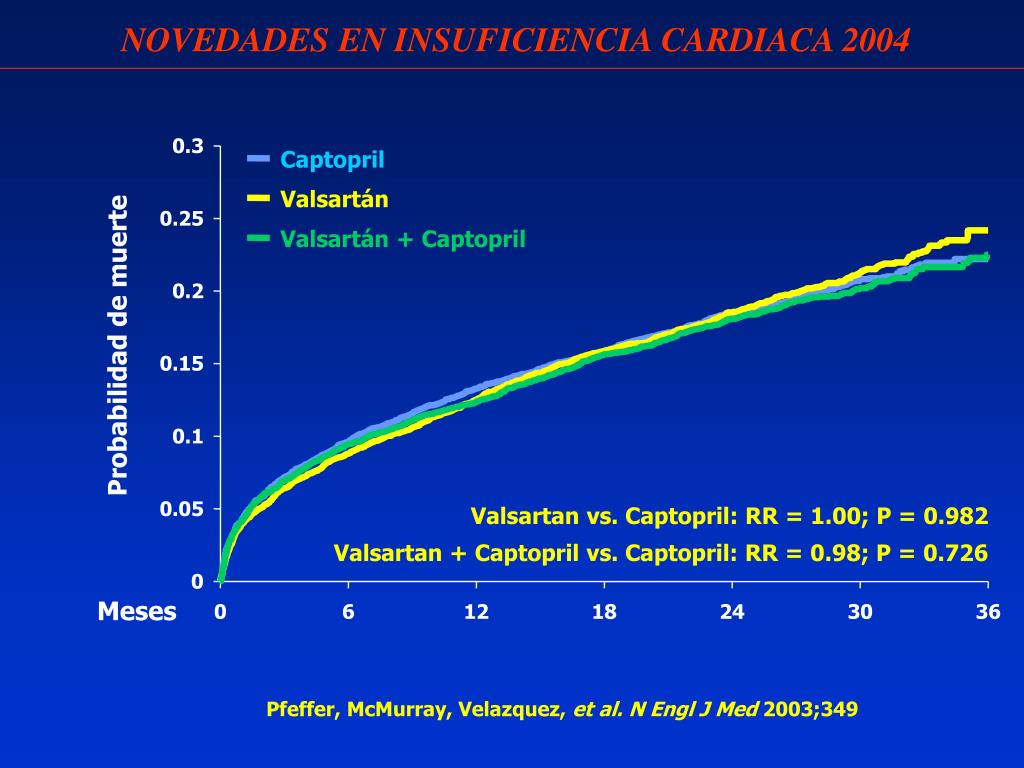 Valsartán Valsartán + Captopril Captopril NOVEDADES EN INSUFICIENCIA CARDIACA 2004 0.3 0.25 0.2 Probabilidad de muerte 0.15 0.1 0.05 Valsartan vs. Captopril: RR = 1.00; P = 0.982 Valsartan + Captopril vs. Captopril: RR = 0.98; P = 0.726 0 Meses 0 6 12 18 24 30 36 Pfeffer, McMurray, Velazquez, et al. N Engl J Med 2003;349