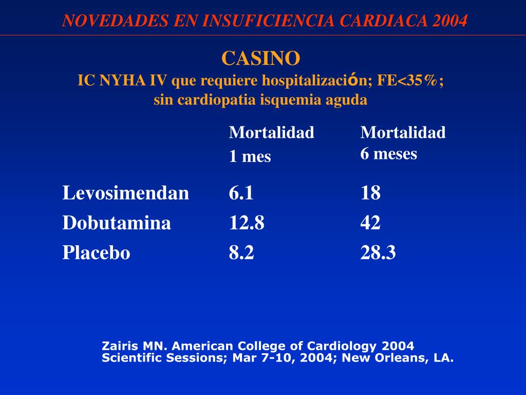 NOVEDADES EN INSUFICIENCIA CARDIACA 2004 CASINO IC NYHA IV que requiere hospitalización; FE<35%; sin cardiopatia isquemia aguda Zairis MN. American College of Cardiology 2004 Scientific Sessions; Mar 7-10, 2004; New Orleans, LA.