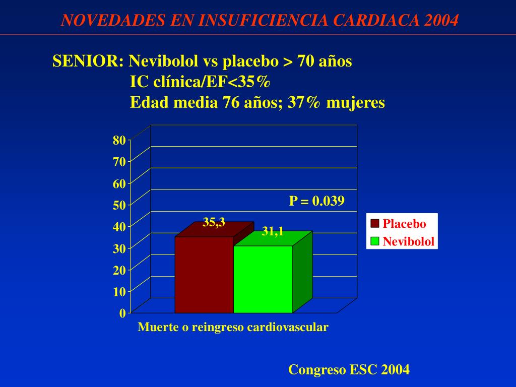 NOVEDADES EN INSUFICIENCIA CARDIACA 2004 SENIOR: Nevibolol vs placebo > 70 años IC clínica/EF<35% Edad media 76 años; 37% mujeres P = 0.039 Congreso ESC 2004