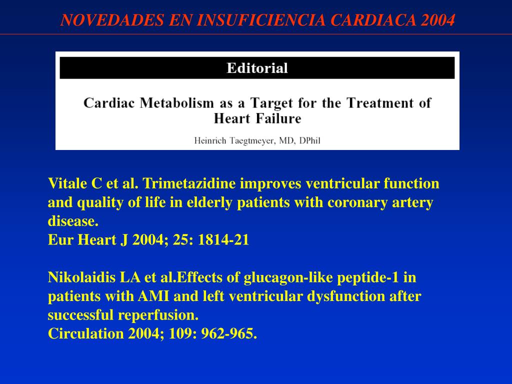 NOVEDADES EN INSUFICIENCIA CARDIACA 2004 Vitale C et al. Trimetazidine improves ventricular function and quality of life in elderly patients with coronary artery disease. Eur Heart J 2004; 25: 1814-21 Nikolaidis LA et al.Effects of glucagon-like peptide-1 in patients with AMI and left ventricular dysfunction after successful reperfusion. Circulation 2004; 109: 962-965.