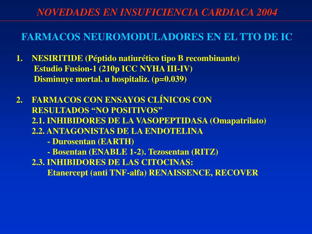 NOVEDADES EN INSUFICIENCIA CARDIACA 2004 FARMACOS NEUROMODULADORES EN EL TTO DE IC • NESIRITIDE (Péptido natiurético tipo B recombinante) • Estudio Fusion-1 (210p ICC NYHA III-IV) • Disminuye mortal. u hospitaliz. (p=0.039) • FARMACOS CON ENSAYOS CLÍNICOS CON • RESULTADOS “NO POSITIVOS” • 2.1. INHIBIDORES DE LA VASOPEPTIDASA (Omapatrilato) • 2.2. ANTAGONISTAS DE LA ENDOTELINA • - Durosentan (EARTH) • - Bosentan (ENABLE 1-2). Tezosentan (RITZ) • 2.3. INHIBIDORES DE LAS CITOCINAS: • Etanercept (anti TNF-alfa) RENAISSENCE, RECOVER