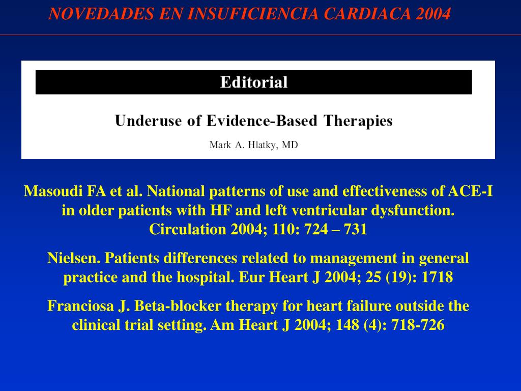 NOVEDADES EN INSUFICIENCIA CARDIACA 2004 Masoudi FA et al. National patterns of use and effectiveness of ACE-I in older patients with HF and left ventricular dysfunction. Circulation 2004; 110: 724 – 731 Nielsen. Patients differences related to management in general practice and the hospital. Eur Heart J 2004; 25 (19): 1718 Franciosa J. Beta-blocker therapy for heart failure outside the clinical trial setting. Am Heart J 2004; 148 (4): 718-726