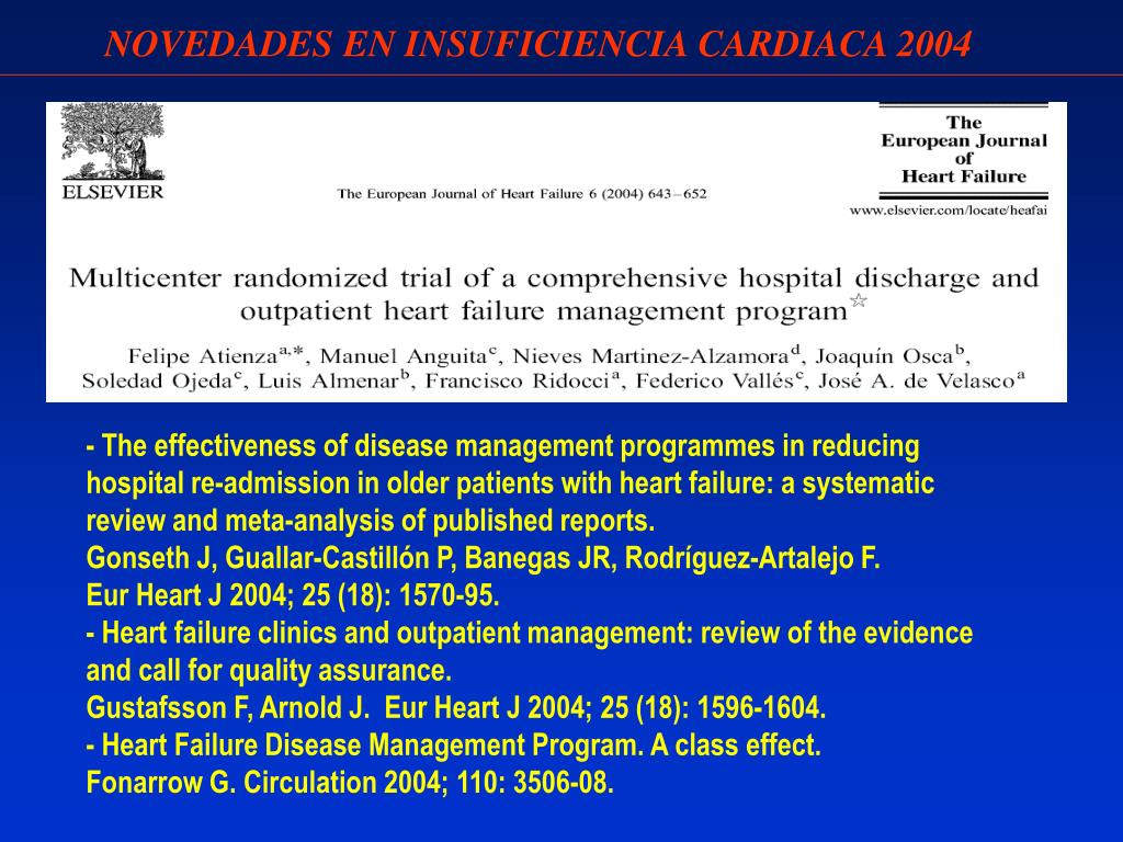 NOVEDADES EN INSUFICIENCIA CARDIACA 2004 - The effectiveness of disease management programmes in reducing hospital re-admission in older patients with heart failure: a systematic review and meta-analysis of published reports. Gonseth J, Guallar-Castillón P, Banegas JR, Rodríguez-Artalejo F. Eur Heart J 2004; 25 (18): 1570-95. - Heart failure clinics and outpatient management: review of the evidence and call for quality assurance. Gustafsson F, Arnold J. Eur Heart J 2004; 25 (18): 1596-1604. - Heart Failure Disease Management Program. A class effect. Fonarrow G. Circulation 2004; 110: 3506-08.