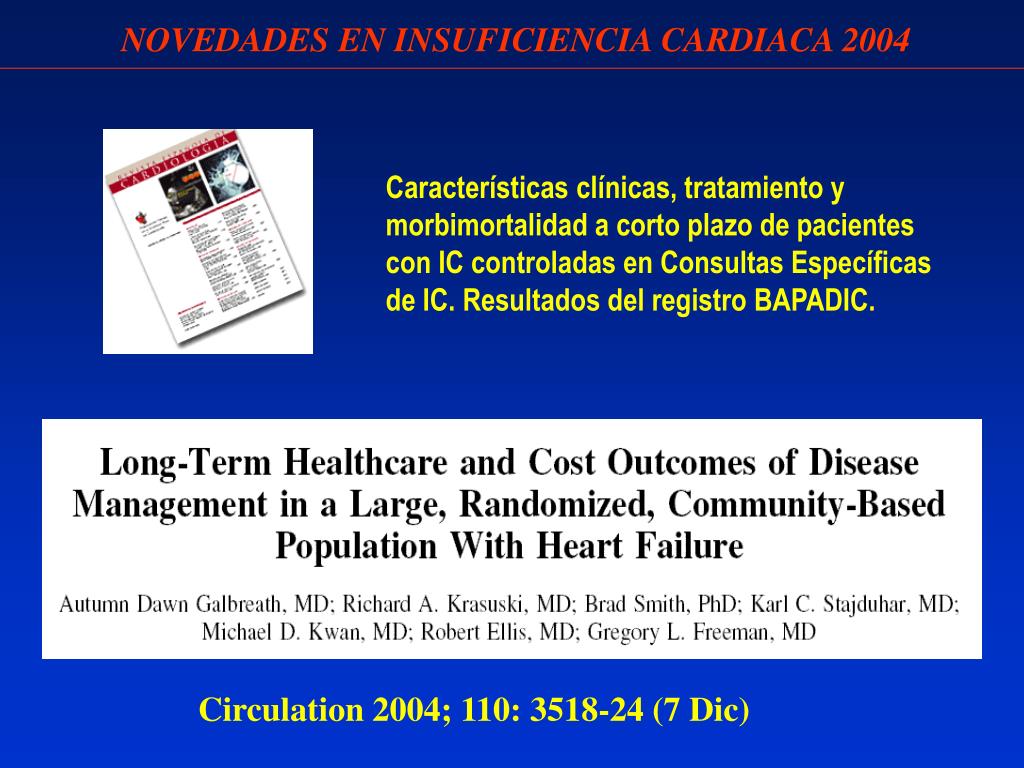 NOVEDADES EN INSUFICIENCIA CARDIACA 2004 Características clínicas, tratamiento y morbimortalidad a corto plazo de pacientes con IC controladas en Consultas Específicas de IC. Resultados del registro BAPADIC. Circulation 2004; 110: 3518-24 (7 Dic)
