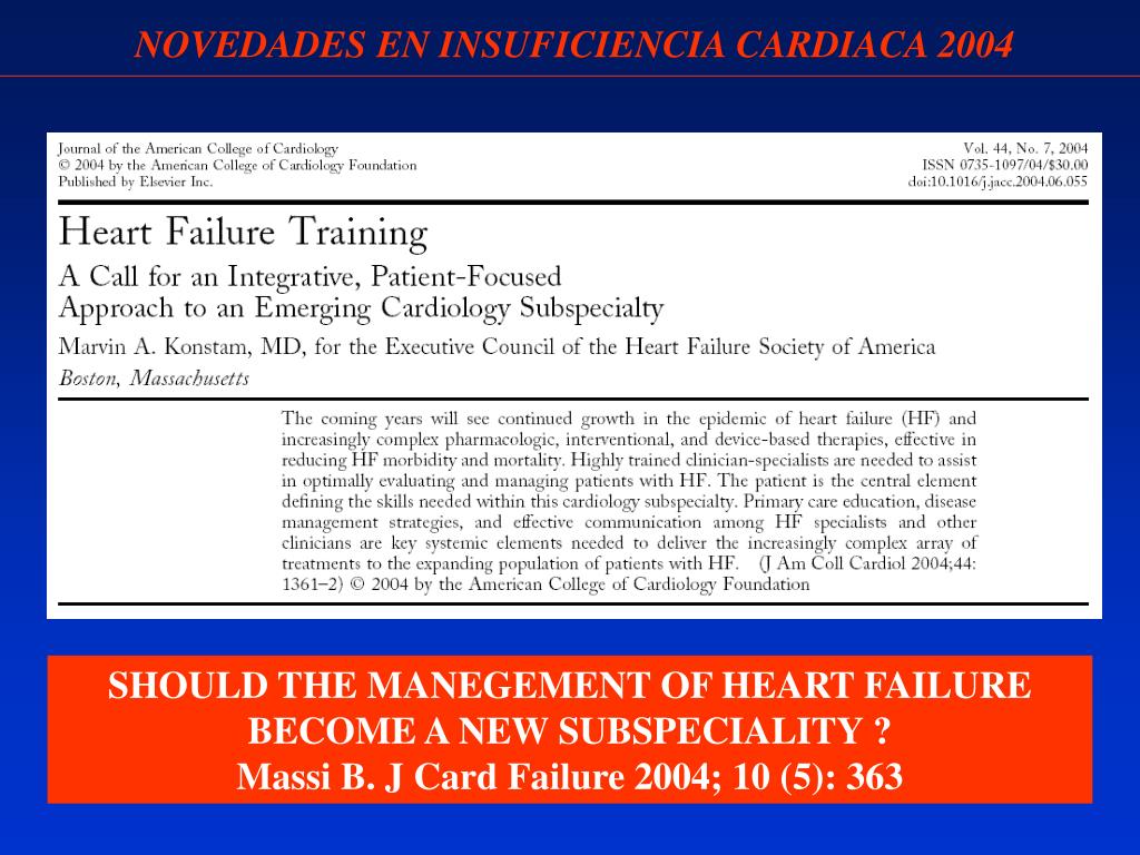 NOVEDADES EN INSUFICIENCIA CARDIACA 2004 SHOULD THE MANEGEMENT OF HEART FAILURE BECOME A NEW SUBSPECIALITY ? Massi B. J Card Failure 2004; 10 (5): 363