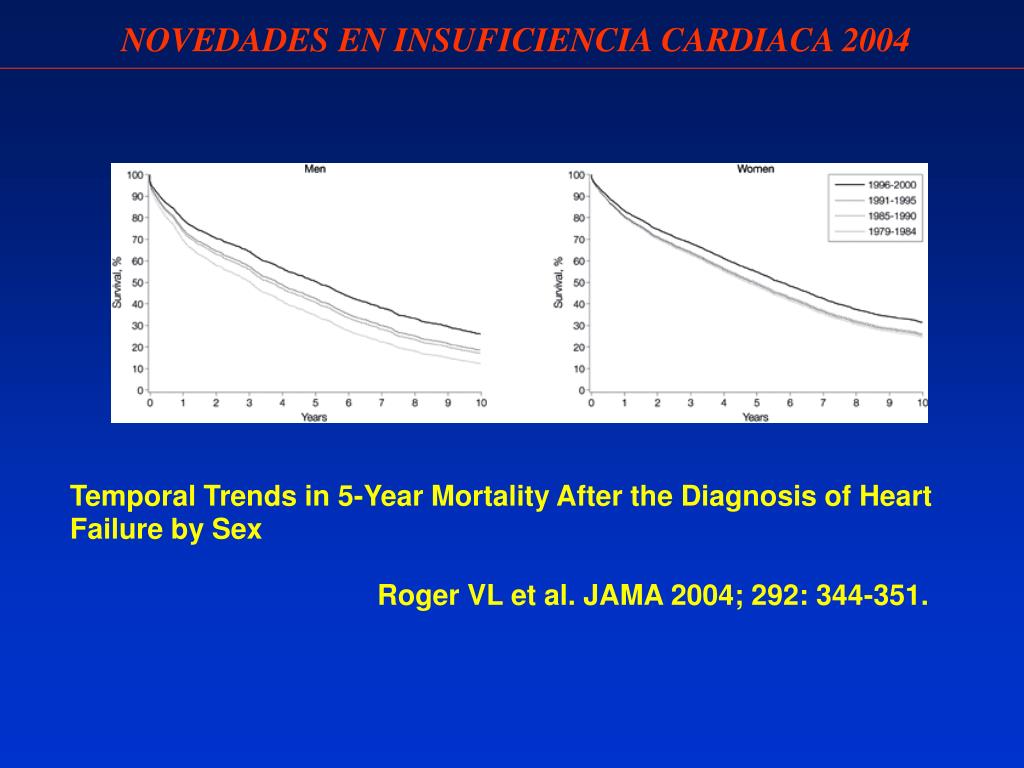 NOVEDADES EN INSUFICIENCIA CARDIACA 2004 Temporal Trends in 5-Year Mortality After the Diagnosis of Heart Failure by Sex Roger VL et al. JAMA 2004; 292: 344-351.
