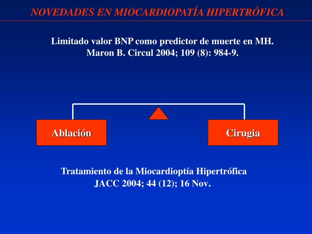 NOVEDADES EN MIOCARDIOPATÍA HIPERTRÓFICA Limitado valor BNP como predictor de muerte en MH. Maron B. Circul 2004; 109 (8): 984-9. Ablación Cirugia Tratamiento de la Miocardioptía Hipertrófica JACC 2004; 44 (12); 16 Nov.
