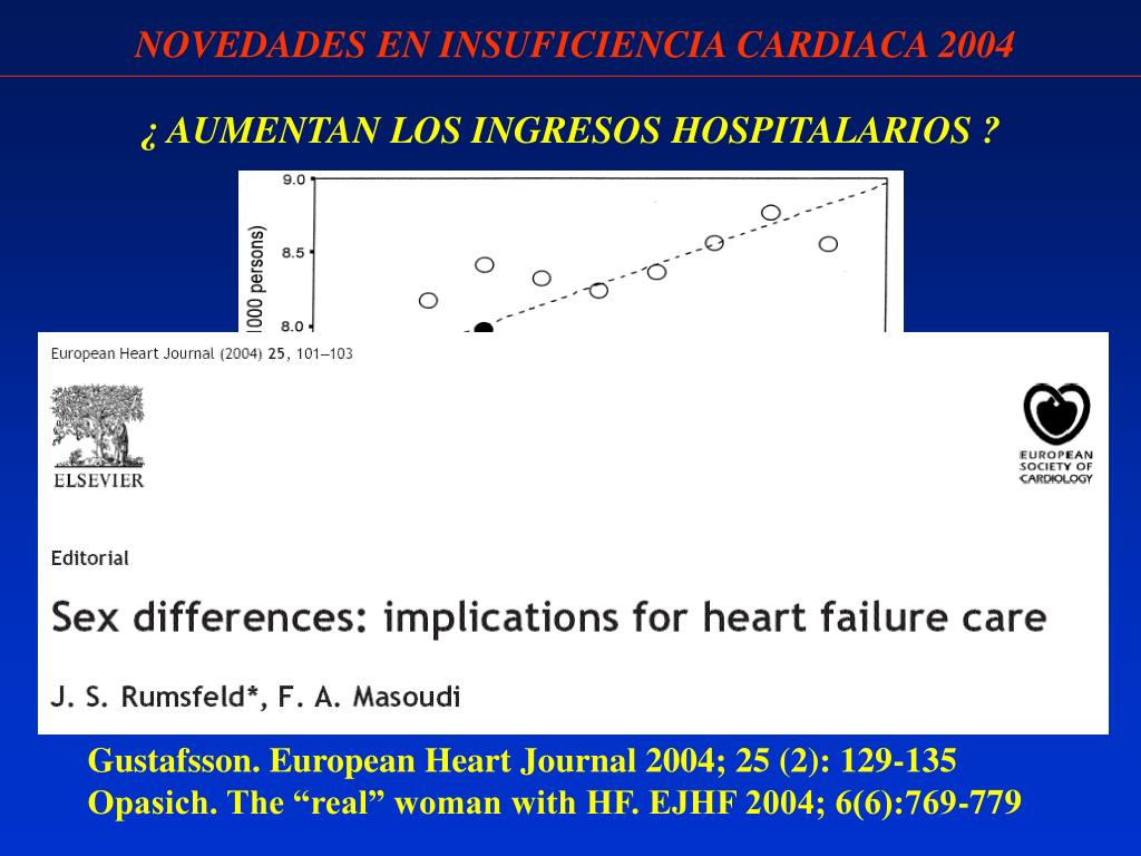 NOVEDADES EN INSUFICIENCIA CARDIACA 2004 ¿ AUMENTAN LOS INGRESOS HOSPITALARIOS ? Koeling Am Heart J 2004; 147: 74-78 MUJERES Y PACIENTES DE EDAD Gustafsson. European Heart Journal 2004; 25 (2): 129-135 Opasich. The “real” woman with HF. EJHF 2004; 6(6):769-779