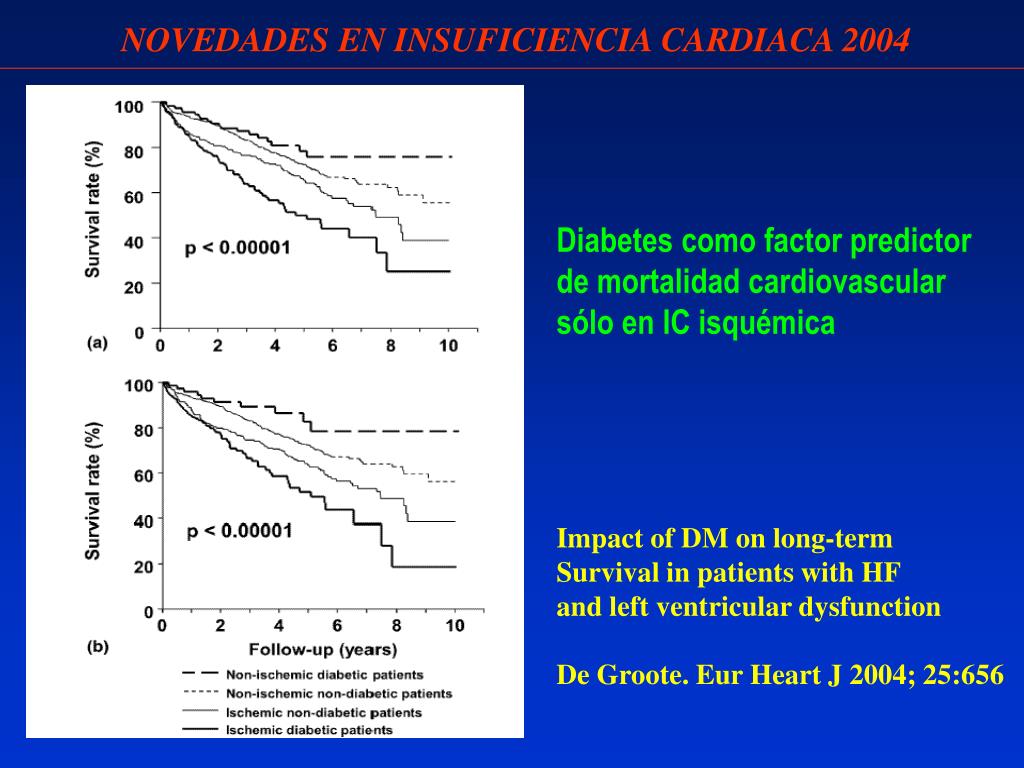 NOVEDADES EN INSUFICIENCIA CARDIACA 2004 Diabetes como factor predictor de mortalidad cardiovascular sólo en IC isquémica Impact of DM on long-term Survival in patients with HF and left ventricular dysfunction De Groote. Eur Heart J 2004; 25:656