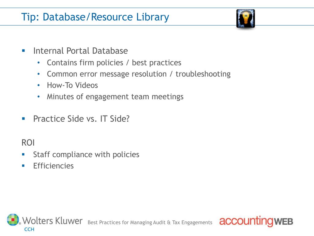 Tip: Database/Resource Library • Internal Portal Database • Contains firm policies / best practices • Common error message resolution / troubleshooting • How-To Videos • Minutes of engagement team meetings • Practice Side vs. IT Side? ROI • Staff compliance with policies • Efficiencies